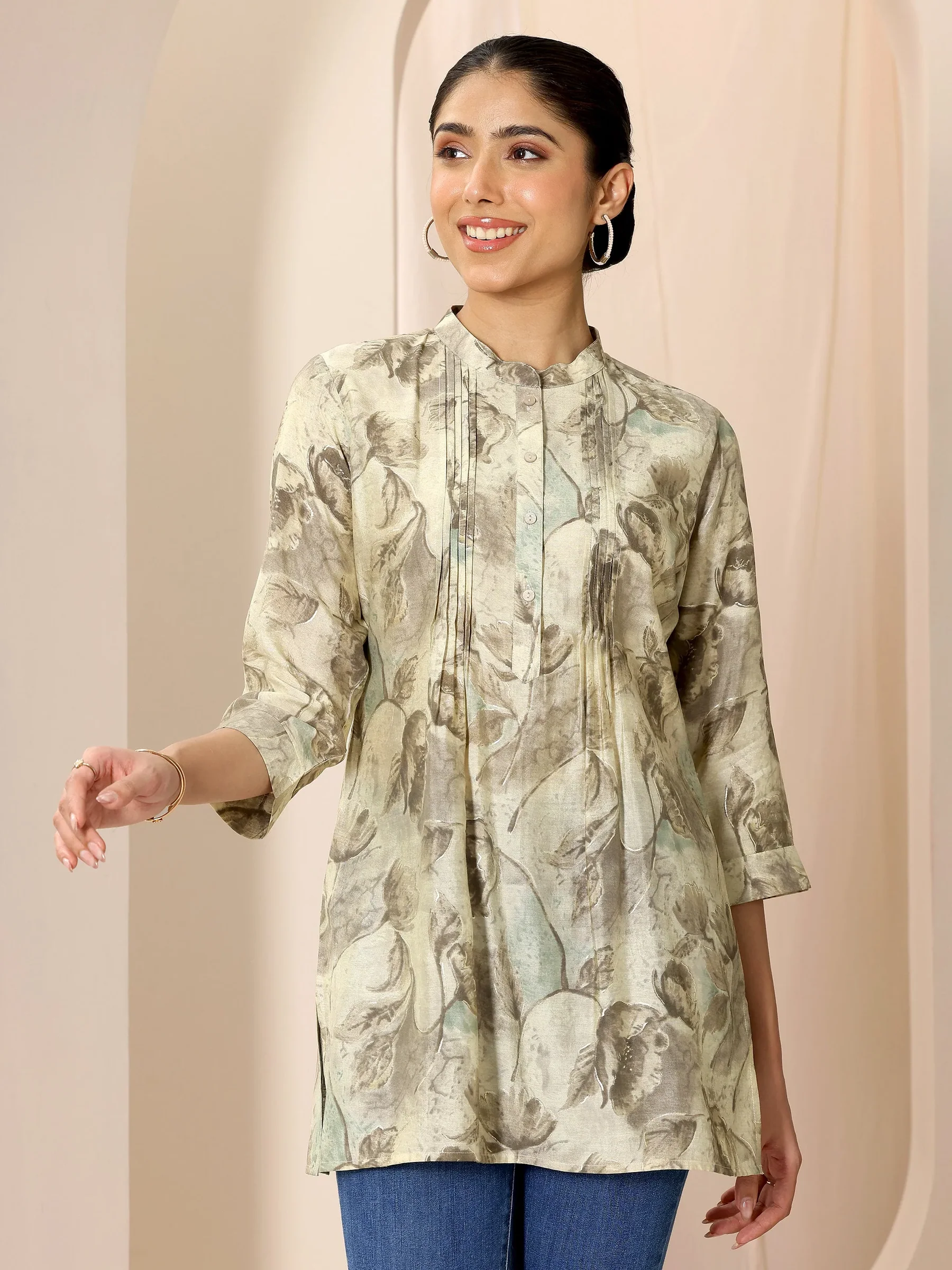 Beige Printed Silk Blend Straight Short Kurti