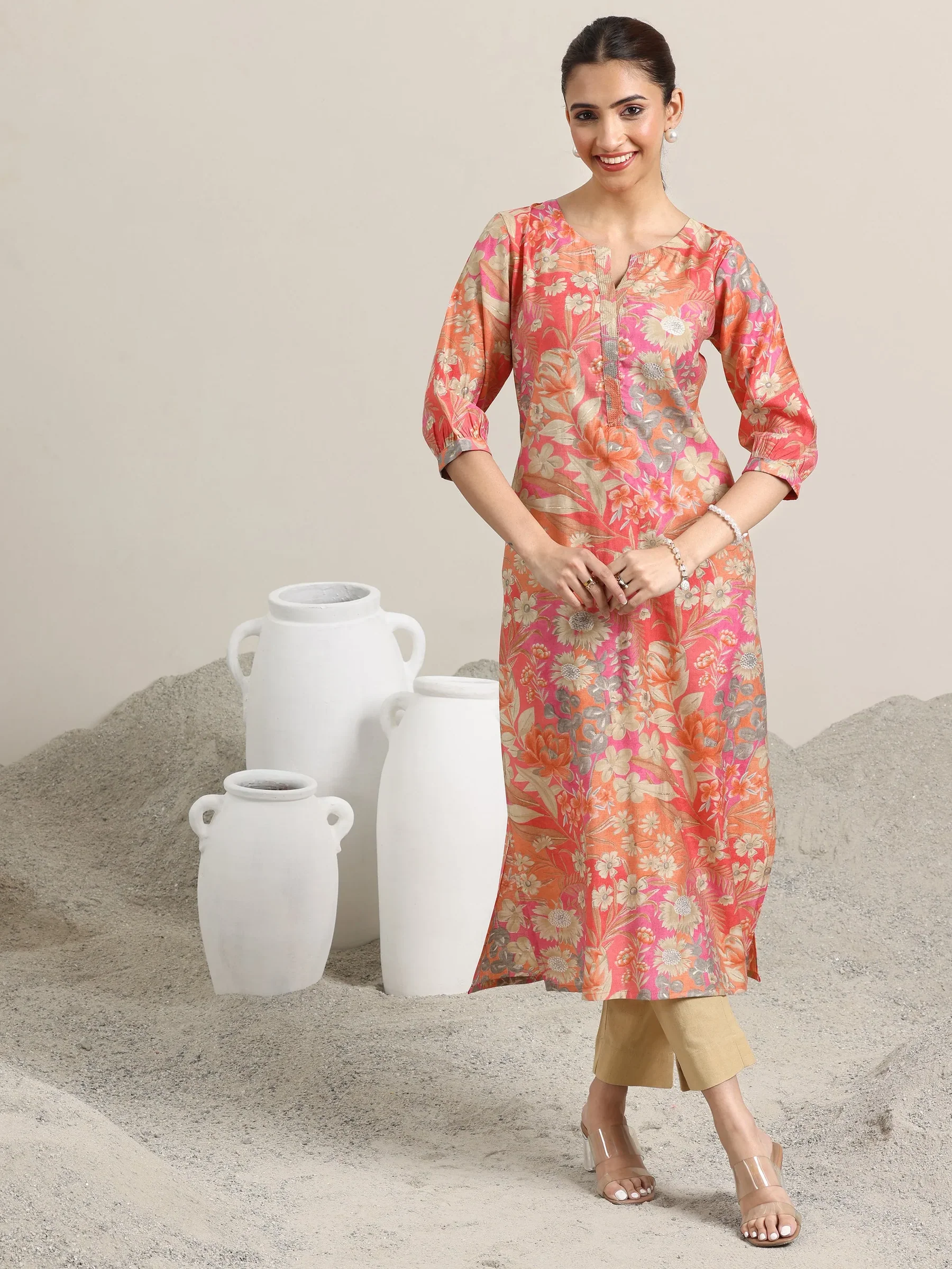 Peach Printed Silk Blend Straight Kurta